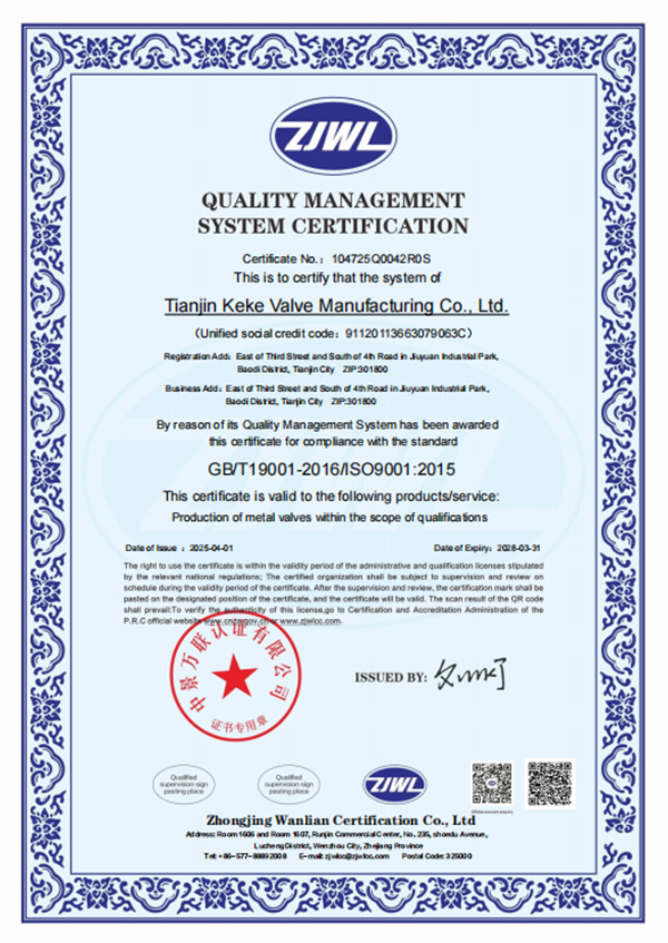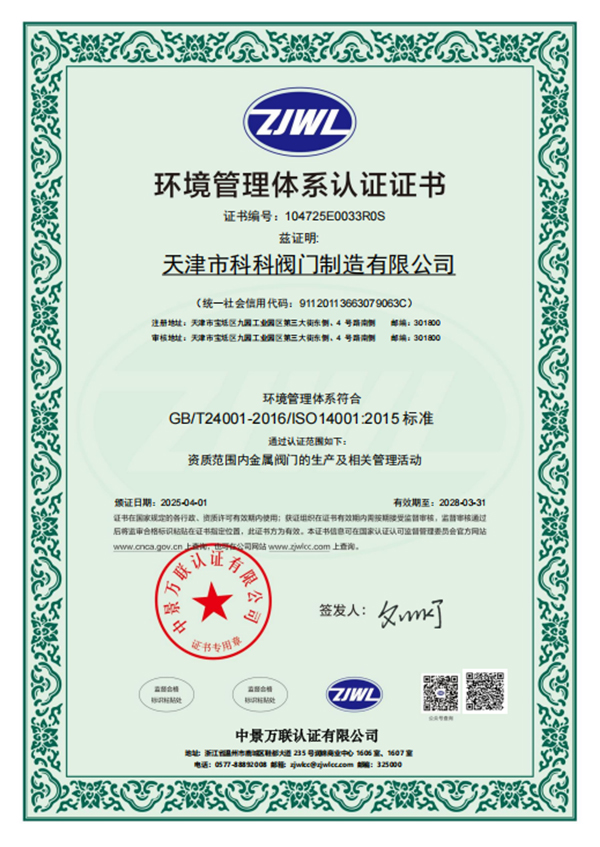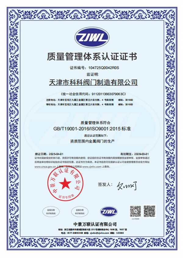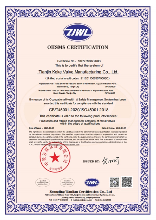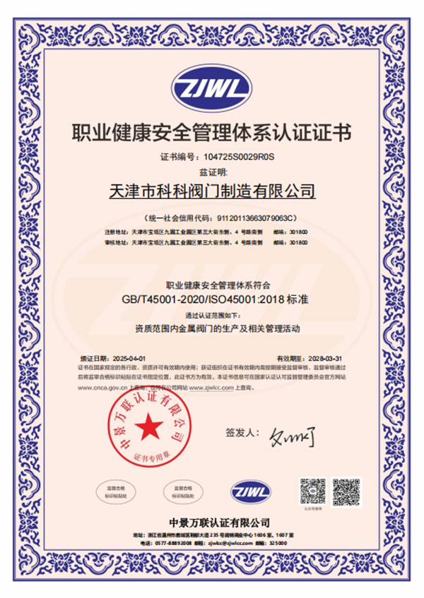 在管理上,天津市科科阀门制造有限公司已经成功获得了ISO9001-2015质量管理体系认证、ISO14001-2015环境管理体系认证以及ISO45001-2018职业健康安全管理体系认证。这些认证不仅证明了公司在管理和运营方面的专业性和规范性,更凸显了其对质量、环境和职业健康安全的高度重视和承诺。